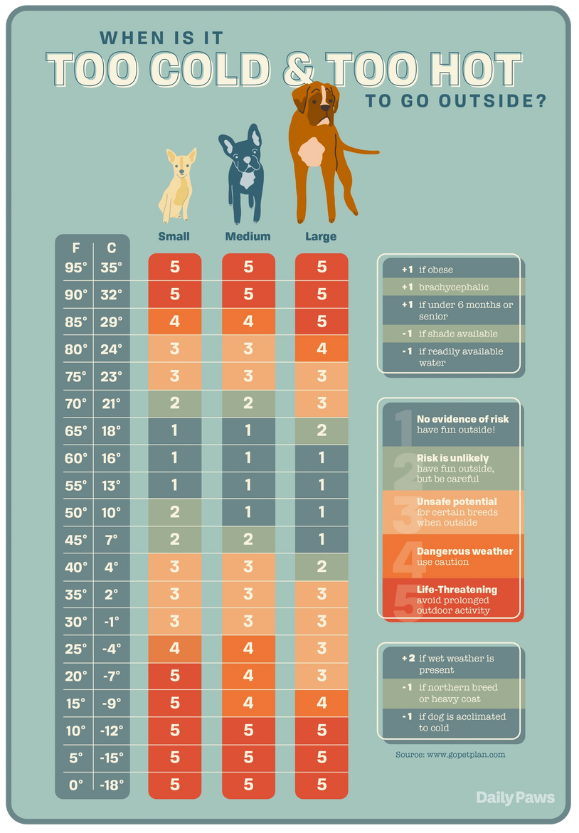 Regarding hot temperatures for dog walking: please see the guide below, as that is what I will be using to assess whether or not it is safe to take your dog out for a walk. Once it gets to the high-80s, I will take them out to go to the bathroom quick and then we will spend our time playing indoors. I will not walk a dog in dangerously hot conditions, no matter if it is the clients preference.
